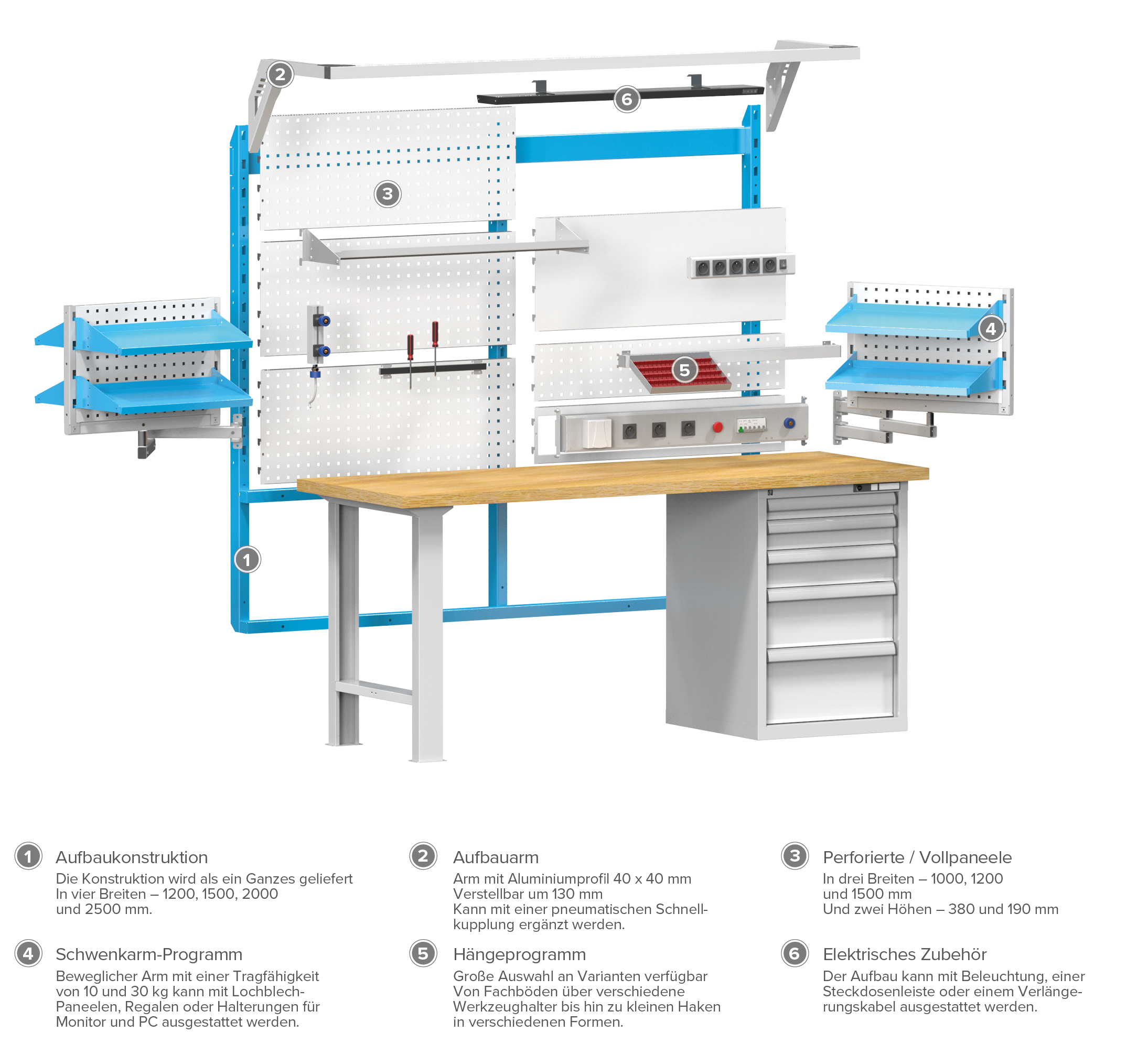 - Einhängeprogramm (Häkchen, Halter, Kunststoffboxen, magnetische Leisten usw.)