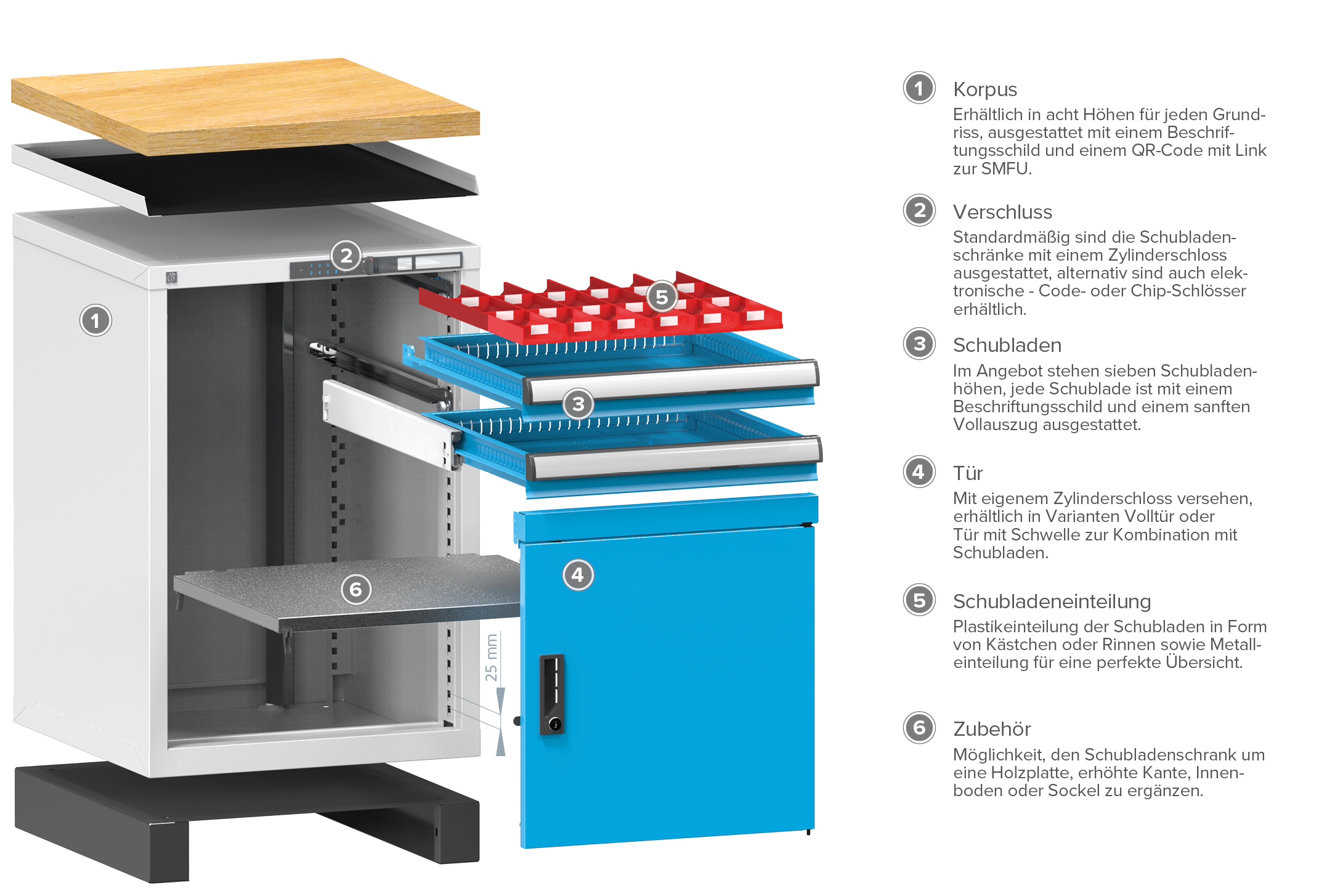 Der Schubladenschrank ist mit Zentralschließung und Schubladenverriegelung versehen. Schubladen sind das Basiselement für die Lagerung von Ware und erfüllen daher hohe Anforderungen an Festigkeit und Stabilität.