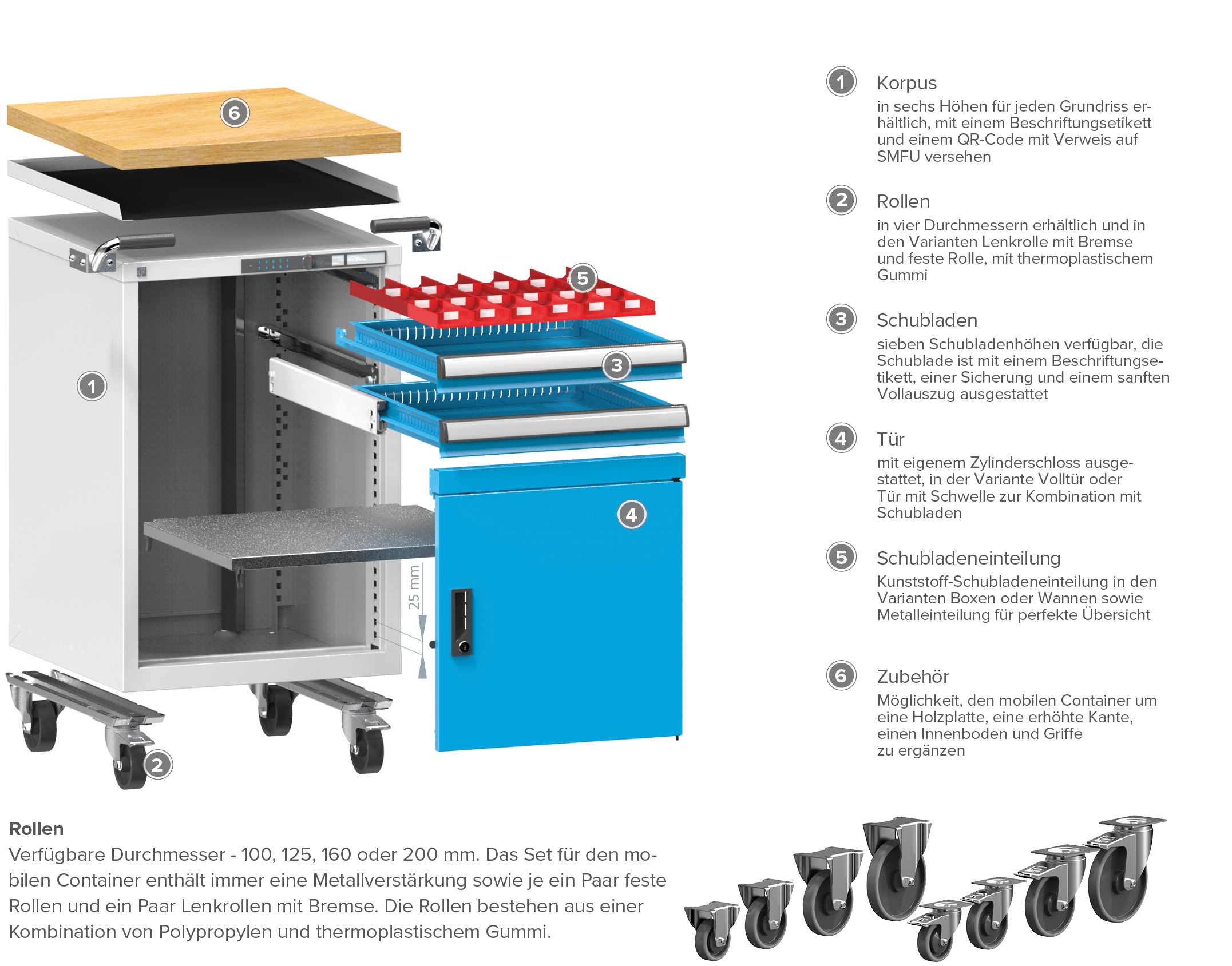 Der mobile Container ist mit Zentralschließung und Schubladenverriegelung versehen. Schubladen sind das Basiselement für die Lagerung von Ware und erfüllen daher hohe Anforderungen an Festigkeit und Stabilität. Die Schubladen des Werkstattwagens sollten stets mit einer Sicherung versehen sein, die das unbeabsichtigte Öffnen der Schublade bei einer Bewegung verhindert.