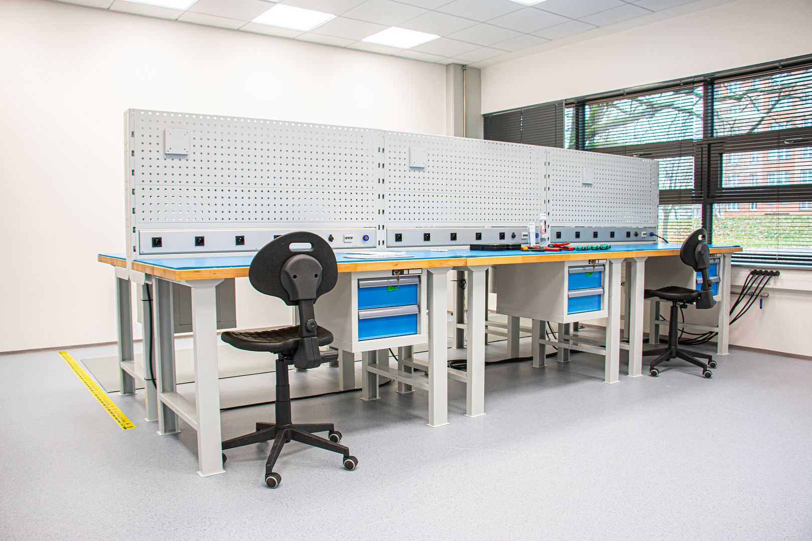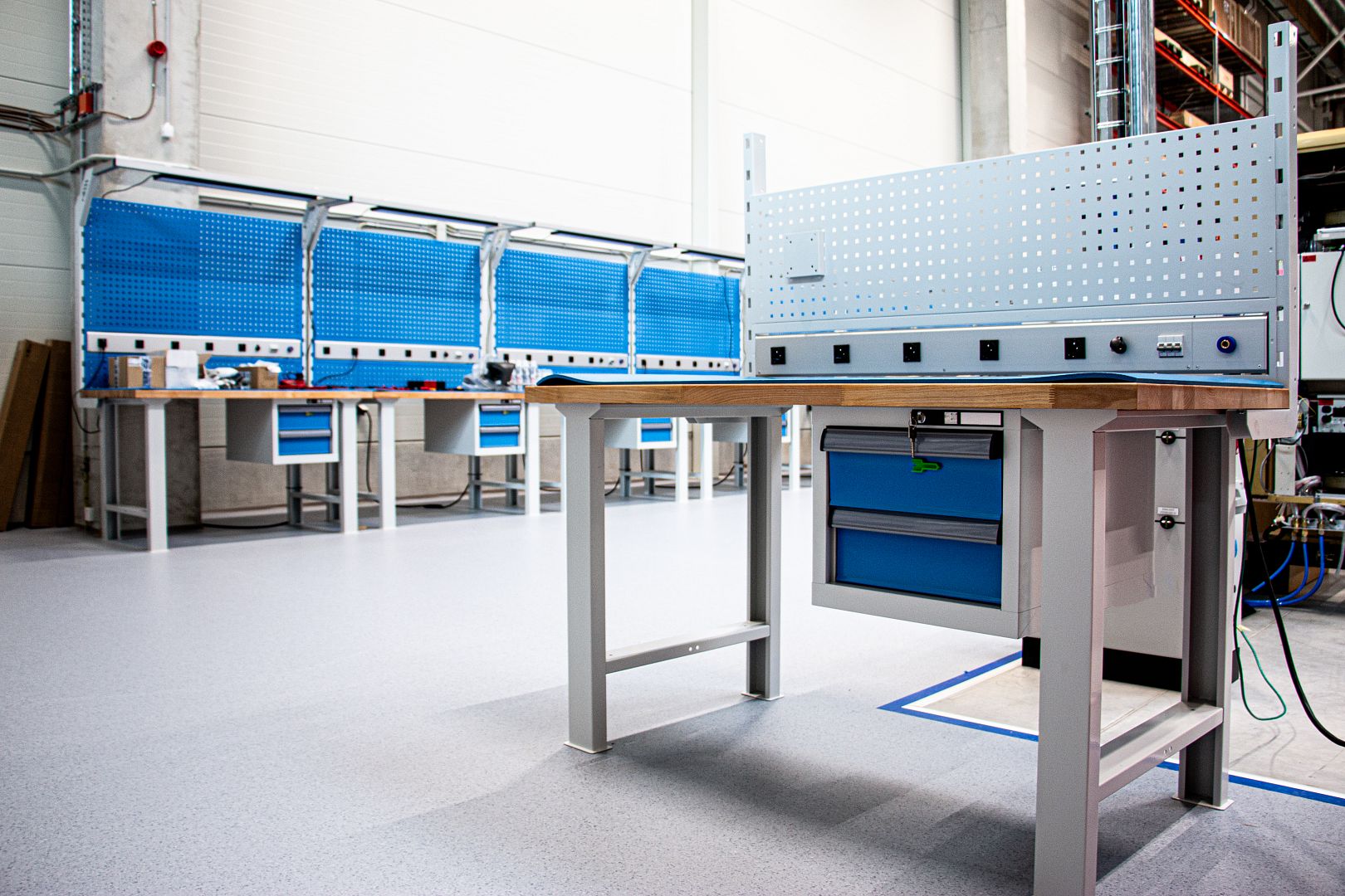 Die Beine der Werkbank können mit Rollen oder Elektroausstattung versehen werden. Der Arbeitsbereich wird erheblich erweitert dank der Aufbauten und des breiten Zubehörs.